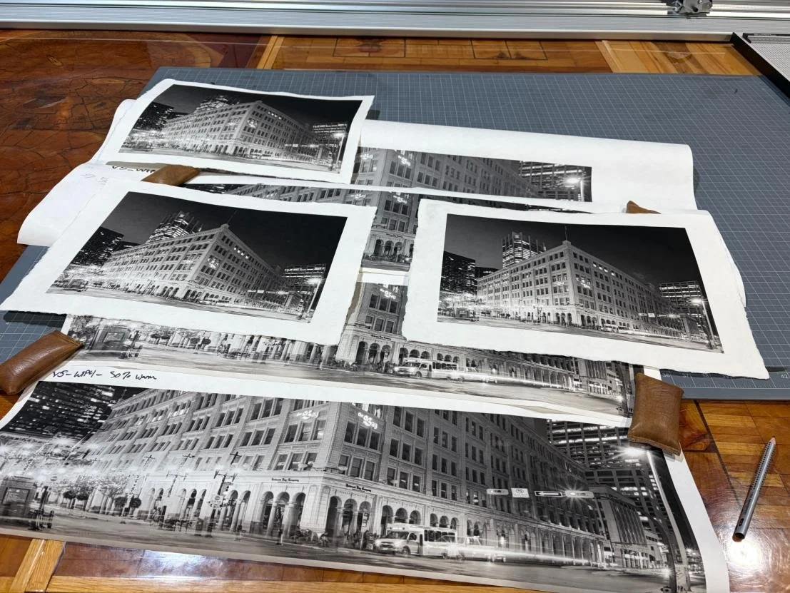 He showed me the work of Calgary photographer Steve Speer whom he was working with for an exhibition at Christine Klassen Gallery for Calgary’s annual photo festival “Exposure” in February. His exhibition will consist of 13 images of iconic Calgary buildings printed on handmade, Japanese Washi paper using carbon inks. The paper was precious. However, in one case a tiny flaw resulted in it being thrown away; in another case the flaw became part of the image. That is the risk you take with handmade papers.