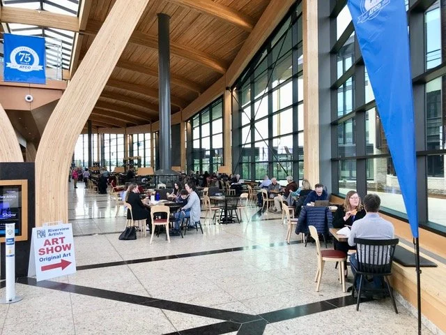 The Blue Flame Kitchen is in the lobby of the ATCO headquarters complex. I love not only the wooden canoe shaped ceiling, but the inviting sense of place and the grand entrance.