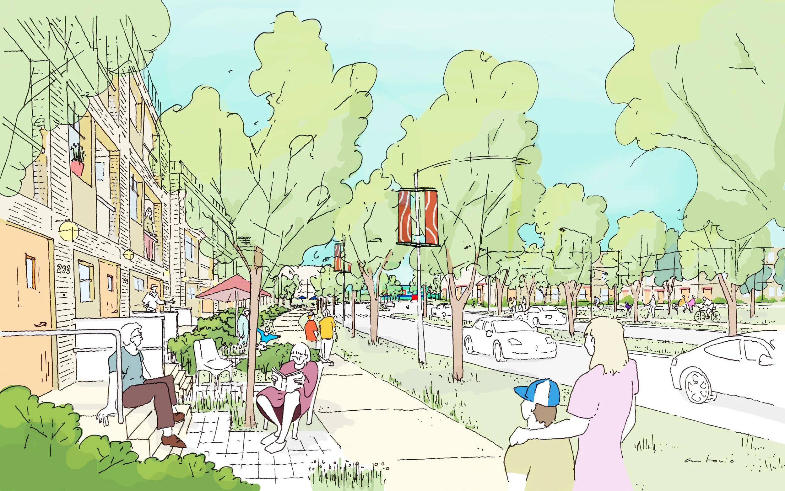 The plan incorporates a variety of building types ranging from townhouses up to 16-storey high rise apartments. With direct access to the street at ground level through patios and public-oriented uses, a ‘porch culture’ will extend from the main street into residential neighbourhoods, and even the office district, creating a sense of safety and social interaction. With 12 kilometres of pathways throughout, the streetscape is interconnected, lively, and supports the day-to-day activities of a vibrant community.