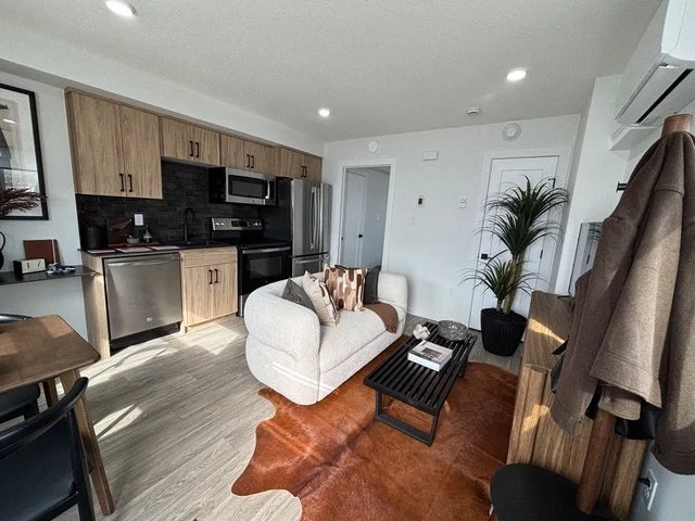 Fom Crowchild Trail this structure looks like big single family suburban home sitting all by itself at 50th Ave SW next to ATCO’s headquarters. But in reality it is a four-plex with two 1-bedroom homes on the main level and two 2-bedroom homes on the upper floors using ATCO’s modular technology.. Given Calgary is Canada’s fastest growing major city, the need for building houses faster and better is critical to the city’s future.