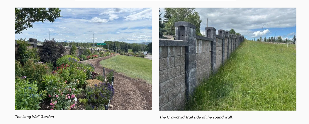 Today Calgary has about 95 km of “noise barriers” or “sound walls.” All new “noise barriers” are built to City guidelines with the specification becoming increasingly sophisticated to absorb more sound and last longer. In addition, the walls are being designed with more attention paid to their aesthetic value (some are made to look like rock, others like wood) rather than just being blank concrete walls.