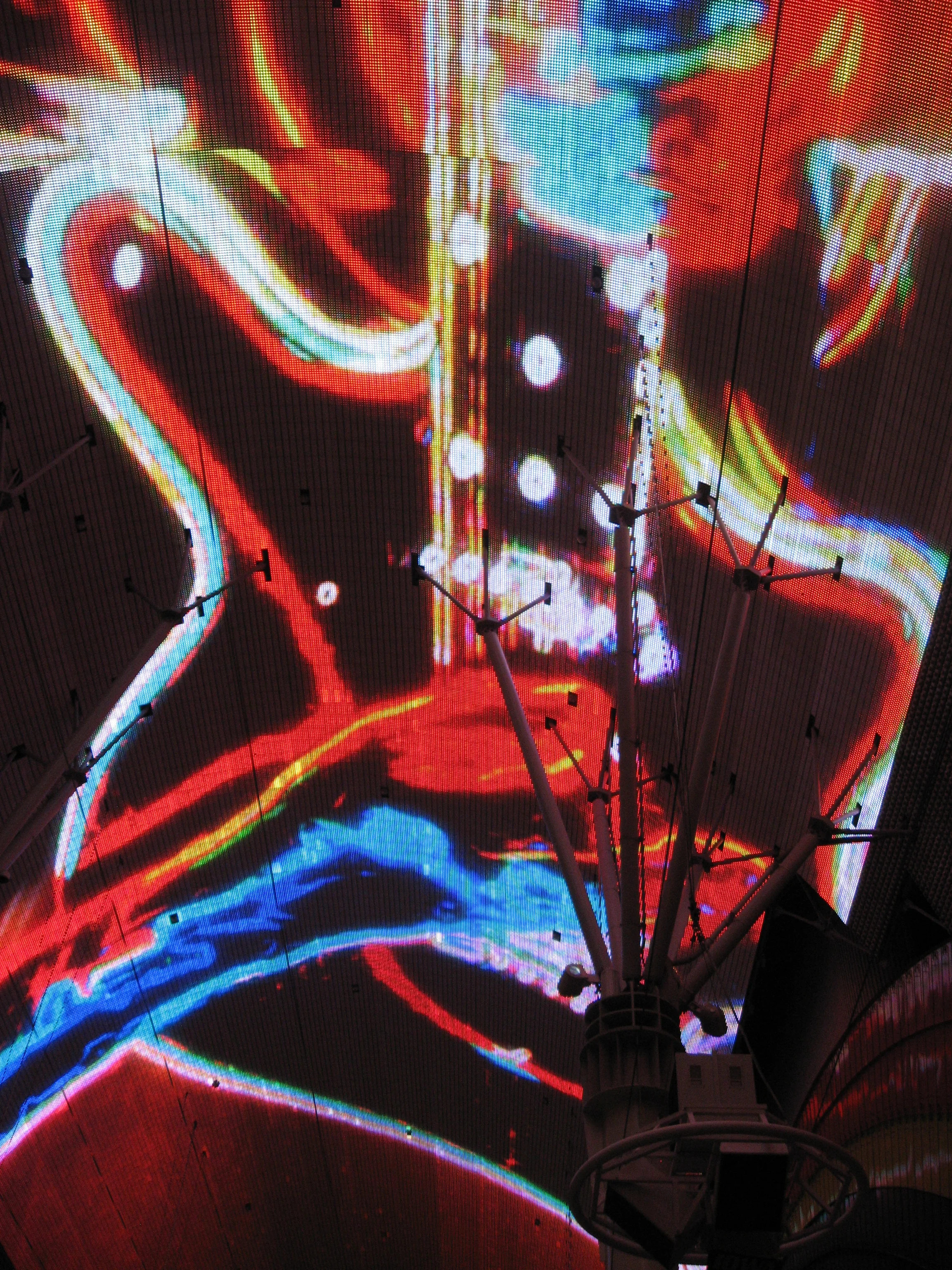 The Freemont Street canopy is washed with colour as thousands of people mill about waiting for the show to begin.