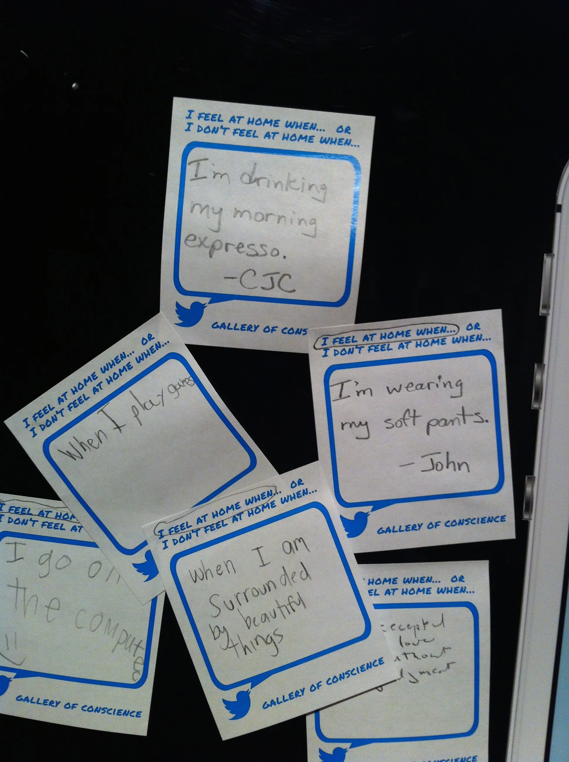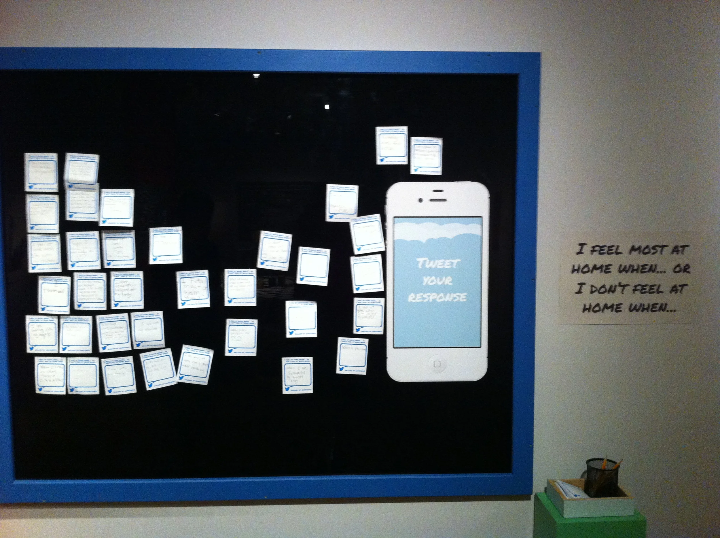 In the Gallery of Conscience there were a number of hands-on activities that related to home. One was called "Find your place at the table" where visitors were invited to take a paper plate, draw their favourite meal on it and place it at the dinner table. Another was for you to take a post-it and write on it as per the above image. The activities were simple to do, fun and thought-provoking.