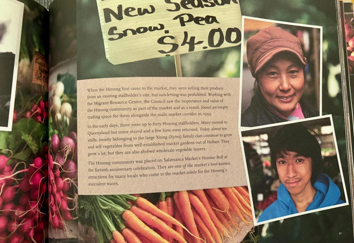 I loved the story about Hmong refugees from China who settled near Hobart in the late 1980s and soon started coming to the market to sell excess vegetables from their backyards and how their brightly embroidered cloths added colour and charm to the market. Originally selling from an existing stallholder’s site, (which was illegal), a permanent empty trading space was for them in 1995. Today they one of the market’s most popular stall holders.