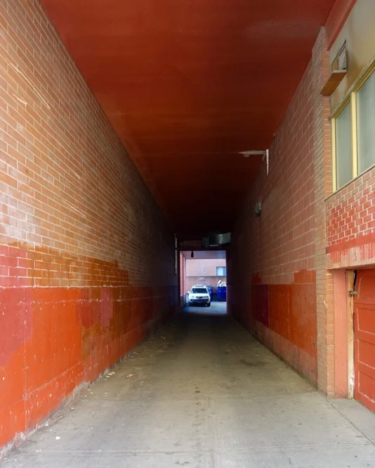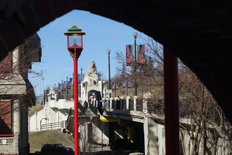 Archway to Chinese Seniors Centre provides a wonderful vista of the Centre Street Bridge and its iconic lions.