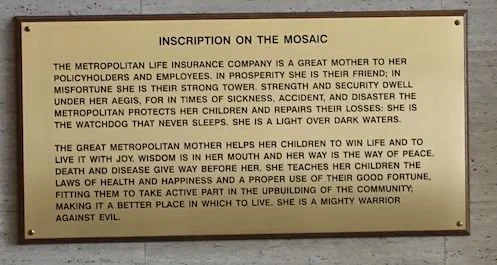 The panel in the lobby states: “Designed and built under the supervision of company architect D. Everett Waid. The building houses one of the most noteworthy mosaics in North America. Modelled after a drawing by U.S. artists Barry Faulkner and crafted by European artisans, the mosaic is mounted on the vaulted ceiling of the foyer. The theme on the allegory depicts the Metropolitan Life as a mother figure personifying life insurance and protecting insured and her employees. Although the Wellington Building now houses the administrative offices of the House of Commons, this artwork is preserved as a symbol, personifying protection agains misfortune and calamity.”