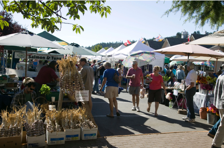 The Saturday Market at Centennial Park in Ganges is one of the few farmers' markets in Canada that enforces a strict producer-only rule: if you sell it, you made it or grew it. Over 120 vendors set up each week from April through October. The result is a market with very little duplication — one person sells goat cheese, another sells kombucha, a third sells ceramic bowls, a fourth is a ten-year-old selling jam.