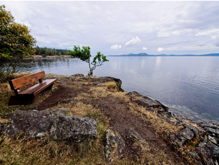 The trails run along a rocky coastline with views across the water toward Vancouver Island and the smaller Gulf Islands beyond. The main Beaver Point trail is level and straightforward, under three kilometres return. A longer loop through the forested interior adds another two hours. On clear days the view from the headlands at low tide, with the tide pools exposed and the mountains visible across the strait, is the kind of thing people drive from Vancouver specifically to see.